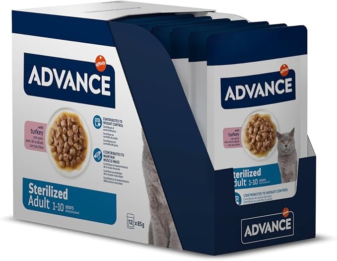 Maintenez le poids de forme de votre chat avec Advance Pâtée Adulte Sterilised Dinde 12 x 85g. Une recette savoureuse à la dinde, pauvre en graisses et riche en fibres, spécialement conçue pour répondre aux besoins métaboliques des chats stérilisés tout en préservant leur santé urinaire.